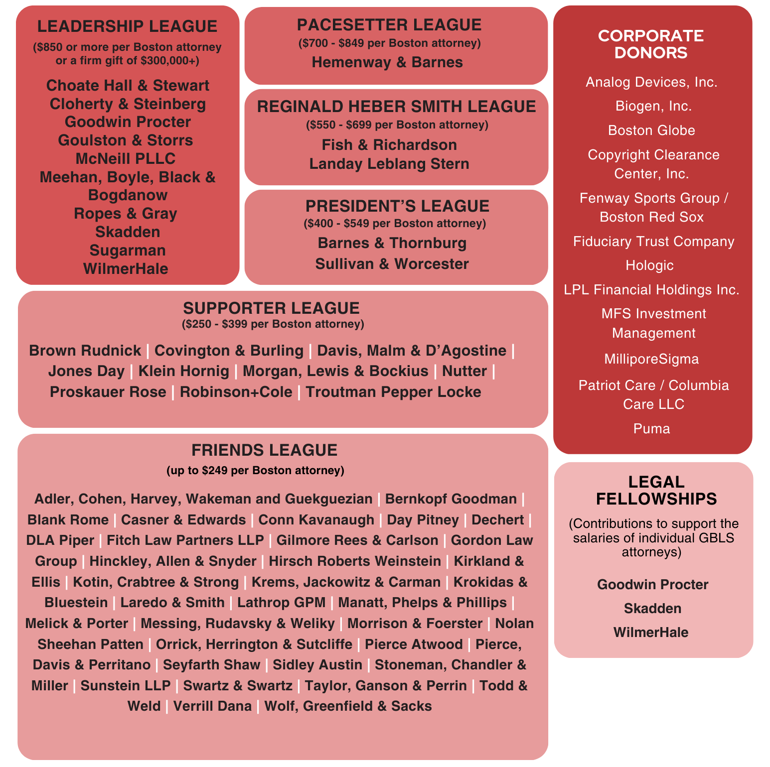 We are grateful to the law firms, corporations, and individual attorneys who give so generously to GBLS. Your support makes our work possible.